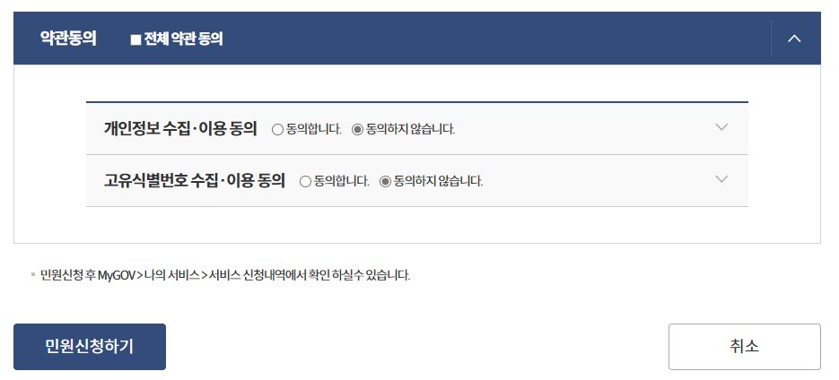 - 신청 정보 입력 및 개인정보수집 이용동의 후 민원신청하기 버튼을 클릭하면 완료됩니다.