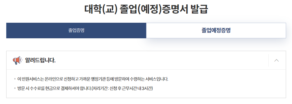 대학교 졸업(예정) 증명서 발급 신청은 본인 또는 대리인이 가능합니다. 하지만 온라인 신청의 경우에는 대리인 신청이 불가능하니 참고하시기 바랍니다.