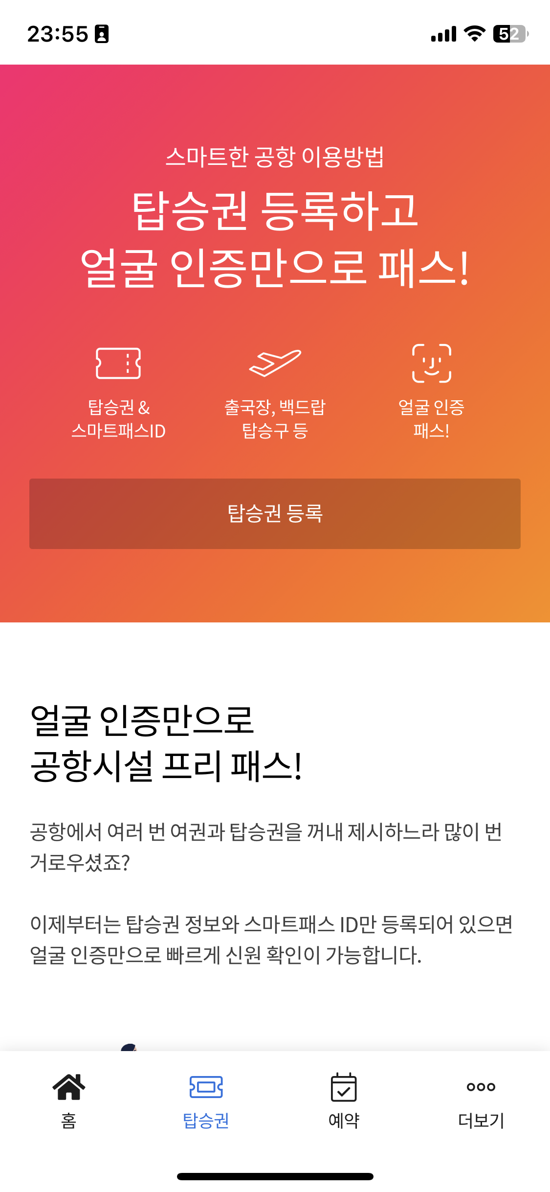 사전 등록 정보를 모두 입력한 후, 앱 내에서 탑승권 등록 및 예약 신청을 진행합니다. 출국일과 항공편 등의 정보를 입력하여 신청을 완료합니다.