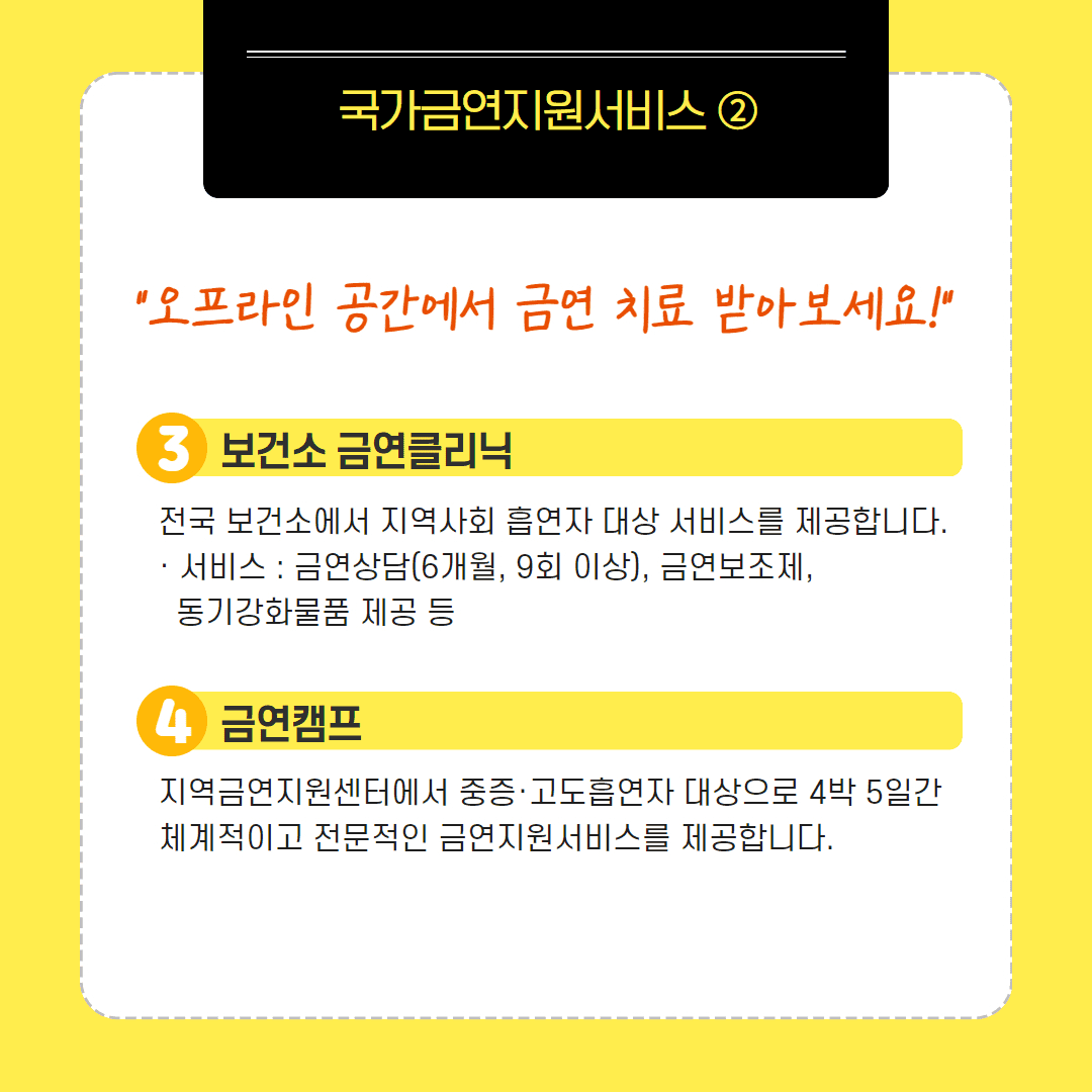 - 지역 금연지원센터에서 중증·고도흡연자 대상 4박 5일간의 체계적이고 전문적인 금연지원서비스 제공