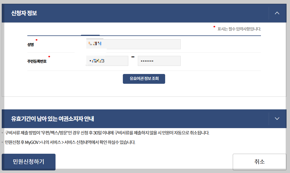 유효기간이 남은 여권을 소지하고 있으면 아래와 같은 화면을 보여 줍니다.