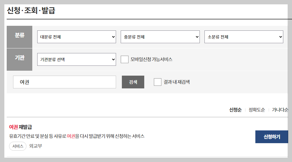 서비스 >> 신청·조회·발급 화면에서 여권으로 검색해서 여권 재발급 화면으로 이동합니다