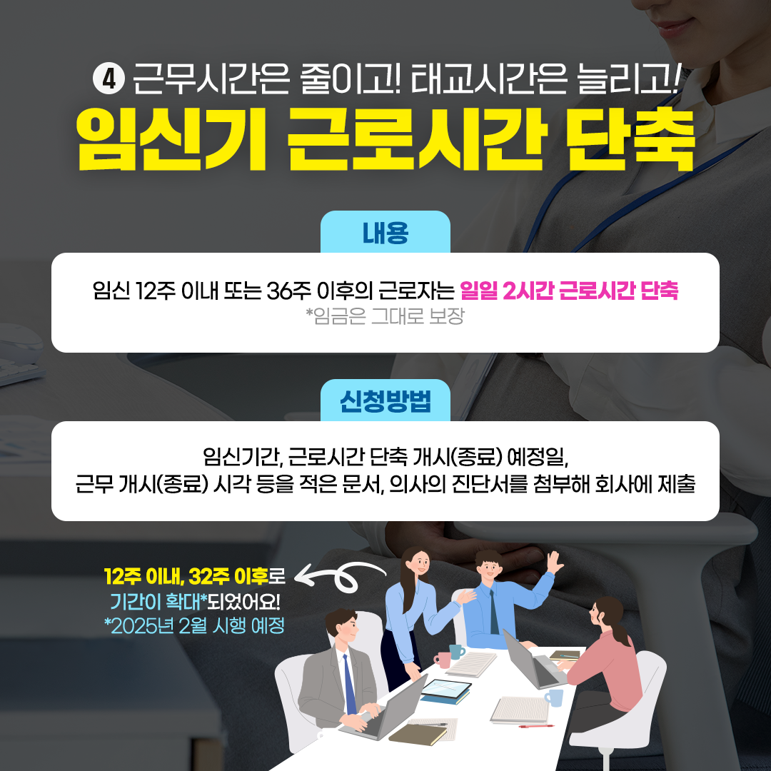 임신 12주 이내 또는 36주 이후의 근로자는 근로시간을 단축할 수 있는 혜택이 주어집니다.