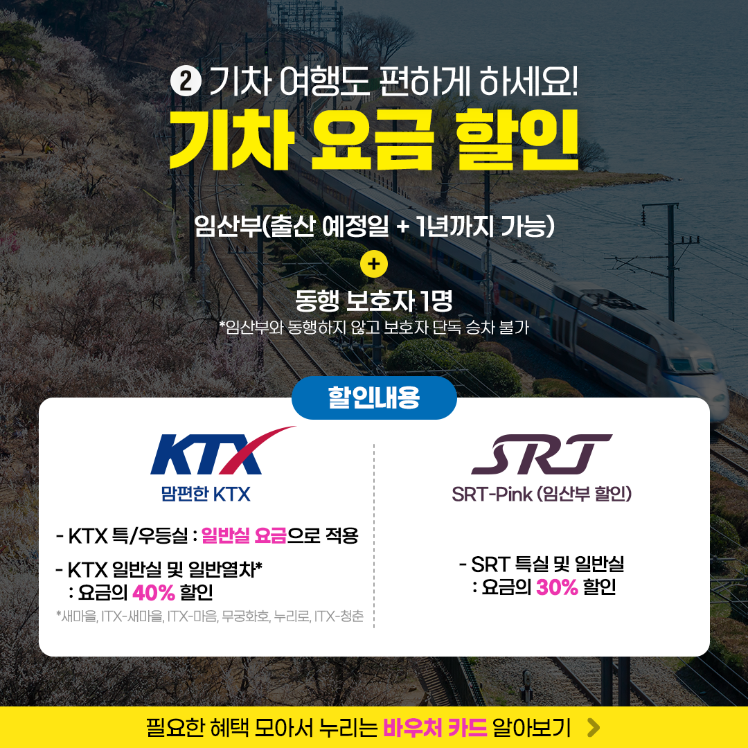 - 맘편한 KTX, SRT 할인: 기차 요금 할인을 통해 편리하게 이동할 수 있습니다.