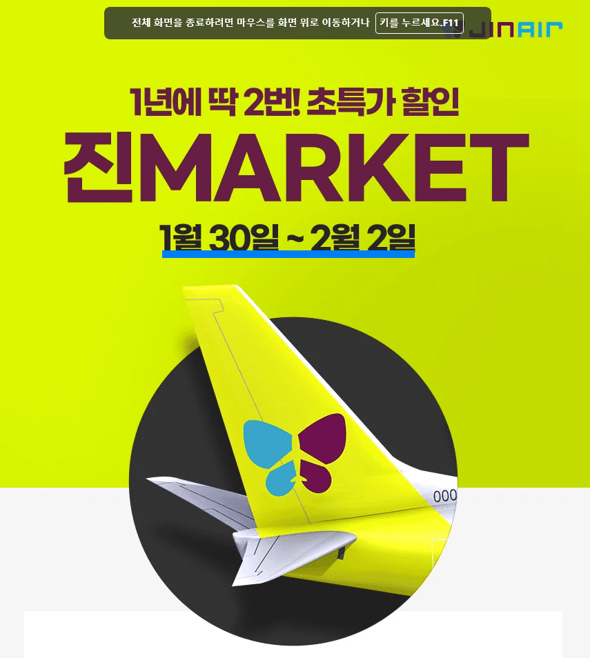 진에어(항공)는 오는 1월 30일 오전 10시부터 2월 2일까지 국제선 항공권을 1년에 단 2번! 초특가 프로모션 진 MARKET을 진행한다고 합니다.