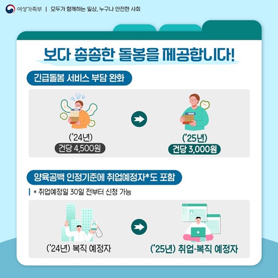 A4. 2025년부터 긴급돌봄 서비스 이용료는 건당 3,000원으로 인하됩니다.